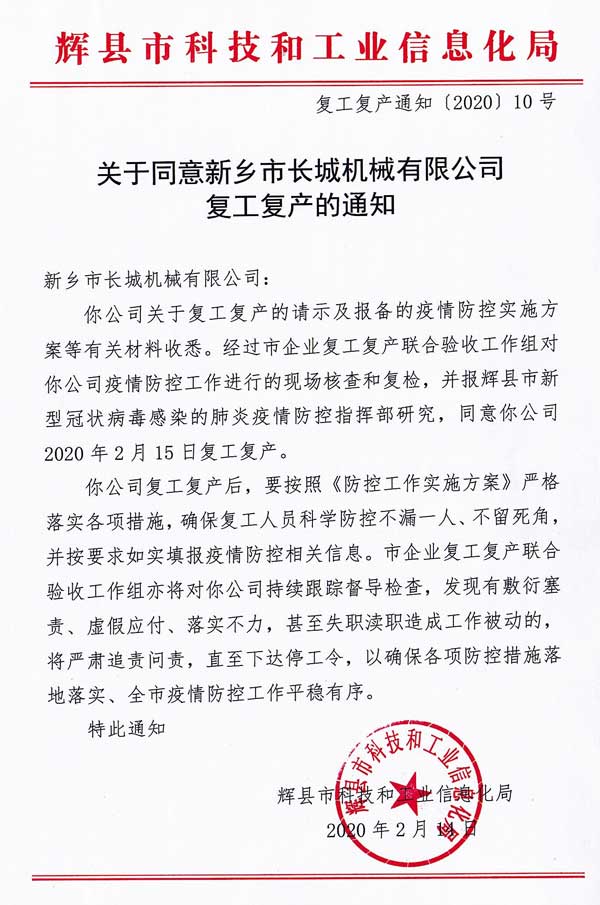 2月14日下午,經(jīng)過(guò)市企業(yè)復(fù)工復(fù)產(chǎn)聯(lián)合驗(yàn)收工作組對(duì)我公司疫情防控工作進(jìn)行的現(xiàn)場(chǎng)核查和復(fù)檢,并報(bào)輝縣市新型冠狀病毒感染的肺炎疫情防控指揮部研究,同意我公司2020年2月15日復(fù)工復(fù)產(chǎn)。